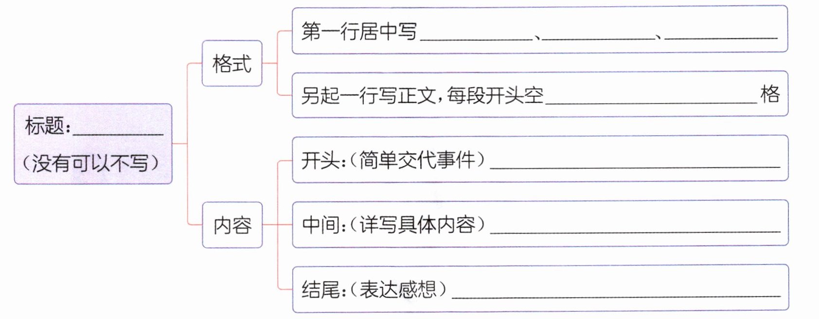 标题可写可不写,通常为日记主题的概括。格式上,第一行需写清年份、月份、日期、星期以及天气情况,正文部分每段开头空两格,可分多段。内容上,开头简单交代事件,中间详写具体内容,结尾表达感想。