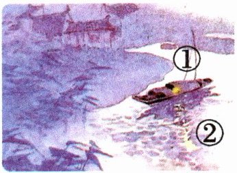 2.第一、二句“月黑见渔灯,孤光一点萤”描写的是在黑暗的夜晚看到渔灯,像一点萤火,对应图中①处船上的渔灯,并非②处,该句错误,填“×”。