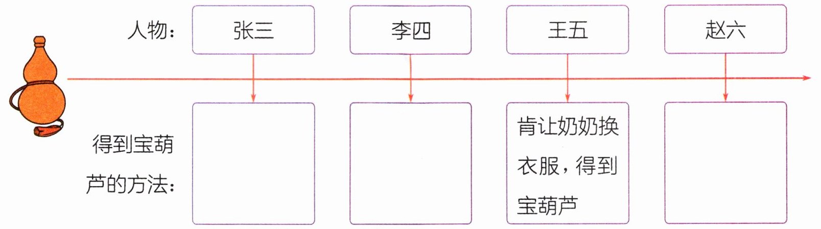 1. (思维导图)奶奶讲的故事中的人物分别是怎样得到宝葫芦的?请完成下图。