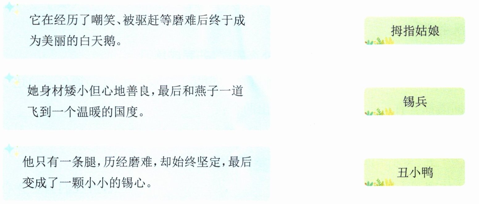 根据《快乐读书吧》中童话故事内容匹配:“经历嘲笑、被驱赶后成为白天鹅”对应《丑小鸭》;“身材矮小、善良、和燕子飞走”对应《拇指姑娘》;“一条腿、坚定、变成锡心”对应《锡兵》。
