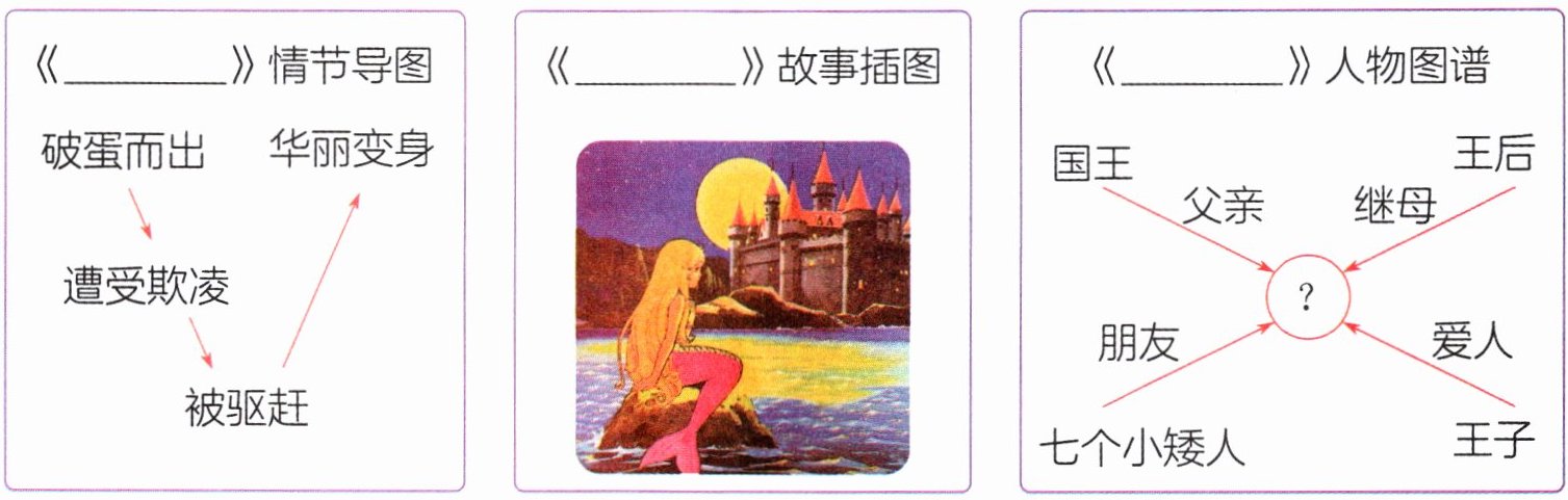 第一张阅读卡情节“破蛋而出、遭受欺凌、被驱赶、华丽变身”对应《丑小鸭》;第二张插图中“美人鱼”形象对应《海的女儿》;第三张人物图谱中“继母、七个小矮人、王子”对应《白雪公主》。