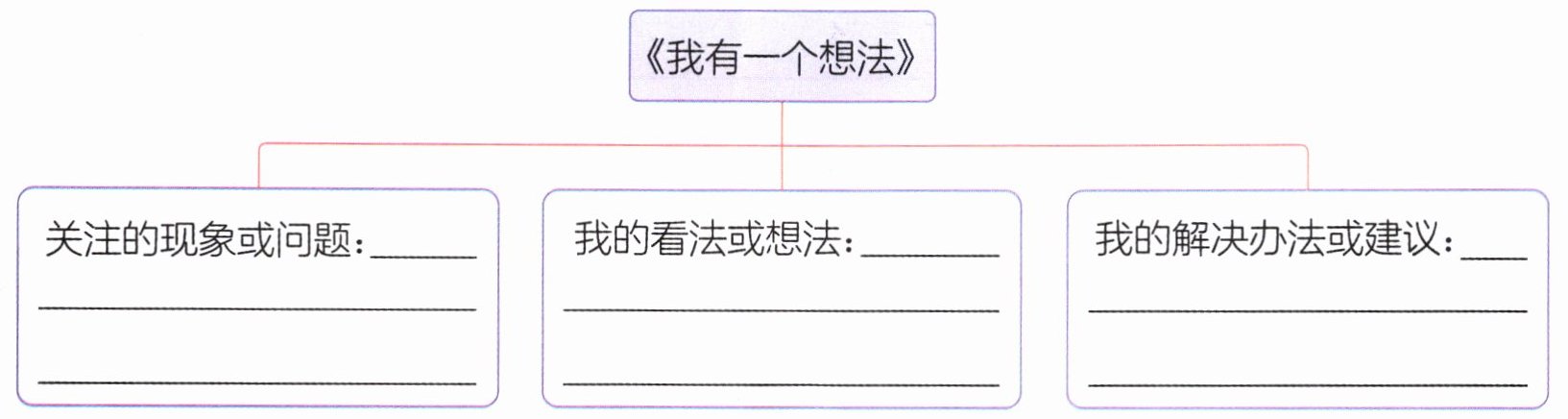 根据三年级上册习作《我有一个想法》的要求,写作思路需围绕“关注现象/问题—个人看法/想法—解决办法/建议”展开,结合生活实际填写具体内容。