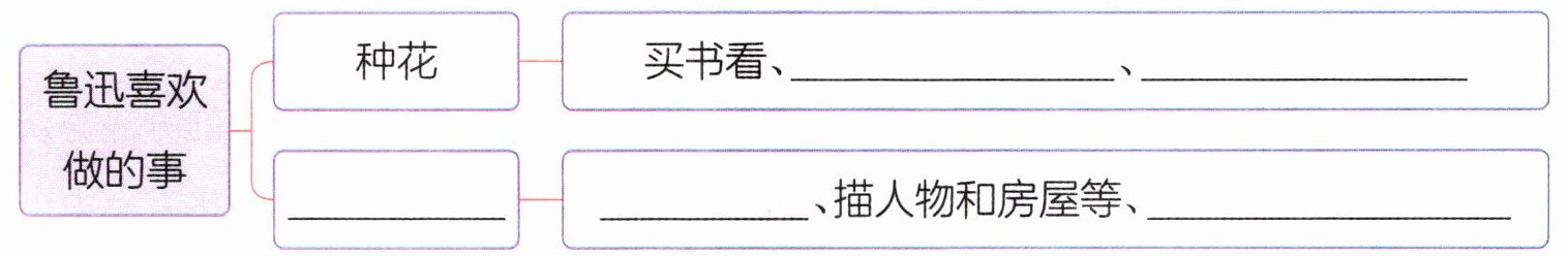 ② 鲁迅小时候也很喜欢玩耍。他怎样玩呢?第一,他喜欢种花。为了种花,他特意买了一本讲怎样种花的书来看。他还专门在各种花旁边插上竹签,写明花的名称,自己觉得津津有味。第二,他喜欢描画。那时候没有美术课,他买了一些很薄的纸,映在绣像小说上,再把书上的人物、房屋等描下来,最后订成一本一本的小册子。