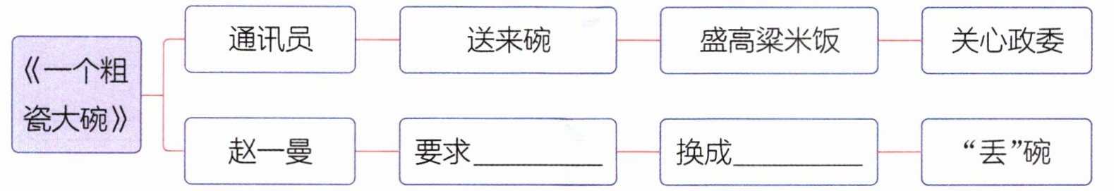 本题可根据课文《一个粗瓷大碗》的内容,结合思维导图已给出的信息进行补充。课文主要讲述了赵一曼烈士使用粗瓷大碗的感人故事,通讯员给赵一曼送来一个粗瓷大碗,她用这碗盛高粱米饭,可她心里关心政委和其他战士;同时赵一曼看到小通讯员给她盛的“高粱米饭”,便要求送回去,换成大伙吃的饭(野菜粥之类),最后这个碗被她“丢”了(其实可能是送给了别人等)。