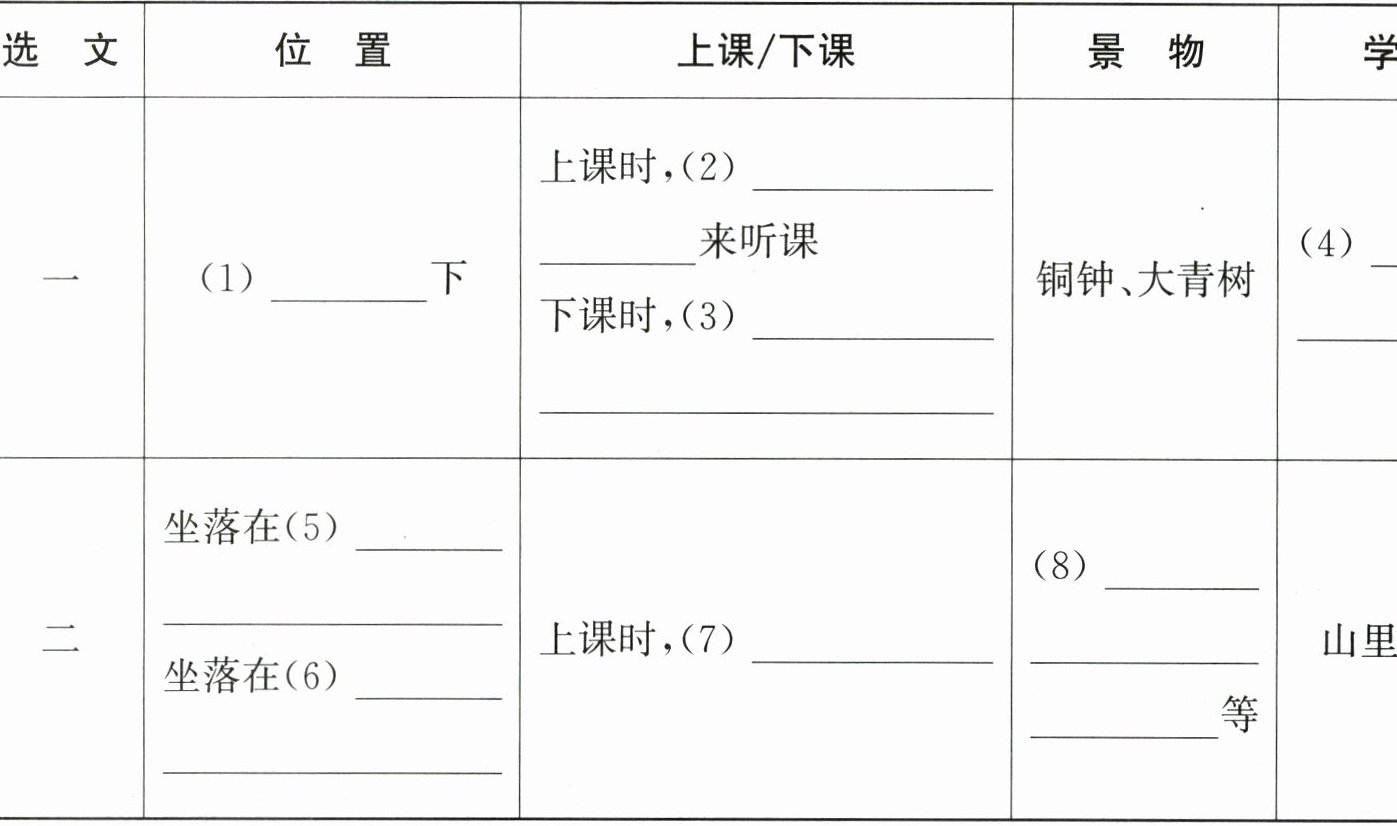 |一|(1)______下|上课时,(2)______来听课下课时,(3)______|铜钟、大青树|(4)______|