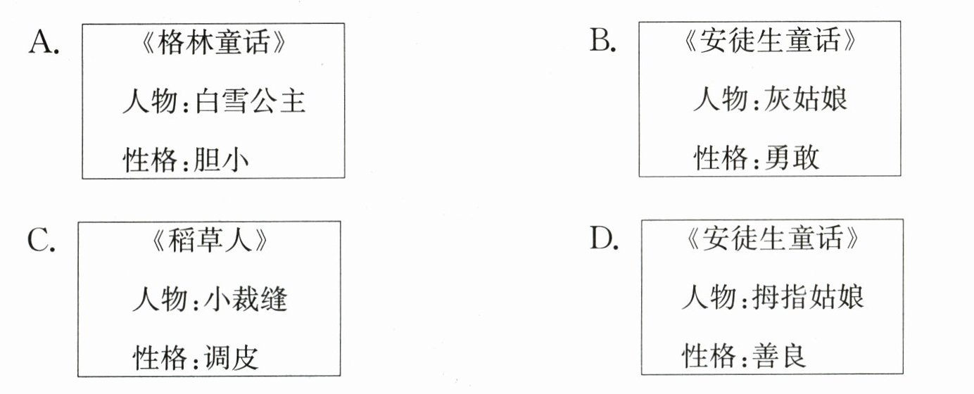 A选项中白雪公主性格并非胆小,而是善良、美丽等;B选项灰姑娘出自《格林童话》,不是《安徒生童话》;C选项小裁缝是《格林童话》中《勇敢的小裁缝》里的人物,不是《稻草人》中的。D选项拇指姑娘是《安徒生童话》中的人物,性格善良,该选项正确。