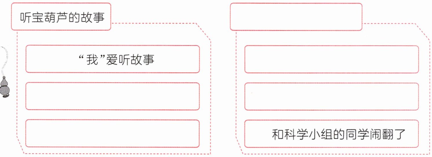 根据课文内容,左列围绕“听宝葫芦的故事”展开,“我”爱听故事后,会产生对宝葫芦的向往,即“想得到宝葫芦”,以及宝葫芦的作用“宝葫芦能实现愿望”;右列“和科学小组的同学闹翻了”是“我”遇到的困难,对应左列的故事背景,右列应先说明“我”遇到困难,具体困难有“数学题不会做”“种向日葵比赛落后”,最后是“和科学小组的同学闹翻了”。