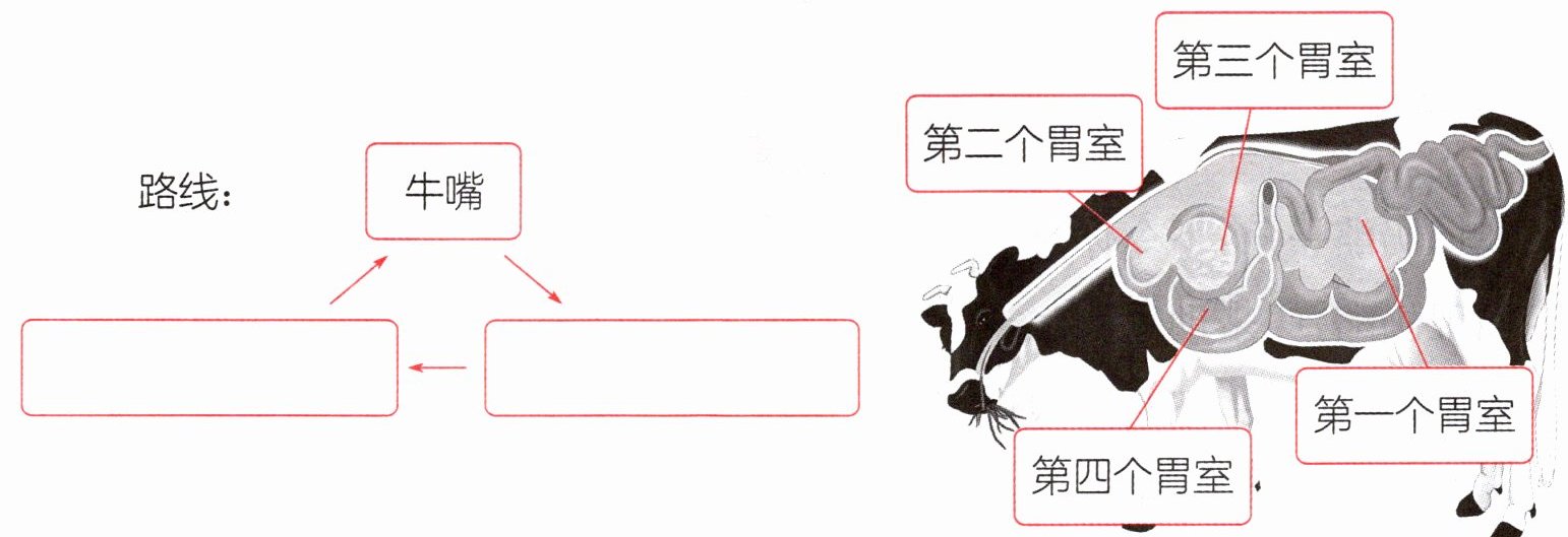 根据课文内容,红头被牛吞入后先进入第一个胃室,然后到第二个胃室,之后牛反刍时从第二个胃室回到牛嘴。路线图中箭头显示“牛嘴”后有两个方向,结合插图及“←”符号,右侧方框为第二个胃室,左侧方框为牛嘴的前一个返回点即牛嘴本身,但根据旅行顺序,应是牛嘴→第一个胃室→第二个胃室→牛嘴。题目中“牛嘴”后为“□□□□□ ← □□□□□”,结合插图标注的胃室名称,右侧方框为第二个胃室,左侧方框为第一个胃室。