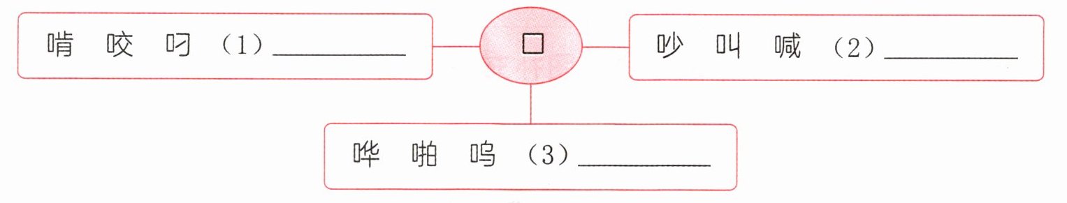 这道题考查对口字旁相关汉字的归类,口字旁的字大多和嘴巴的动作或声音有关。“吱、含、唤”三个字中,“含”是嘴巴的一种动作,和“啃、咬、叼”一类;“唤”与“吵、叫、喊”一样,都表示发出声音、呼叫;“吱”属于模拟声音的字,和“哗、啪、呜”同类。