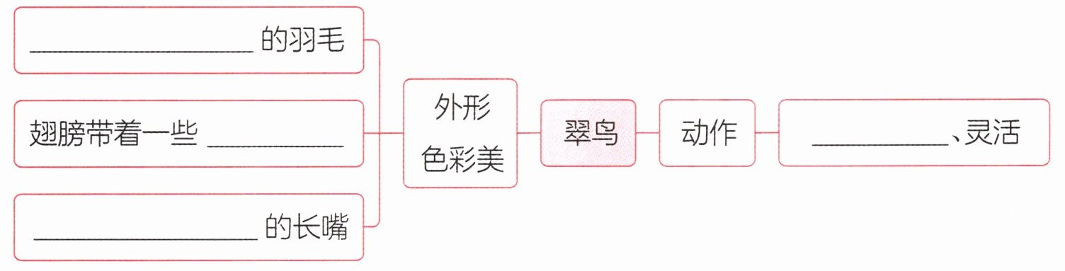 本题可根据课文《搭船的鸟》中对翠鸟外形和动作的描写来补充思维导图。文中“它的羽毛是翠绿的,翅膀带着一些蓝色,比鹦鹉还漂亮。它还有一张红色的长嘴”描述了翠鸟的外形;“我正想着,它一下子冲进水里,不见了。可是,没一会儿,它飞起来了,红色的长嘴里衔着一条小鱼。它站在船头,一口把小鱼吞了下去”描述了翠鸟捕鱼时动作敏捷、灵活。所以从左到右依次可填入翠绿、蓝色、红色、敏捷。