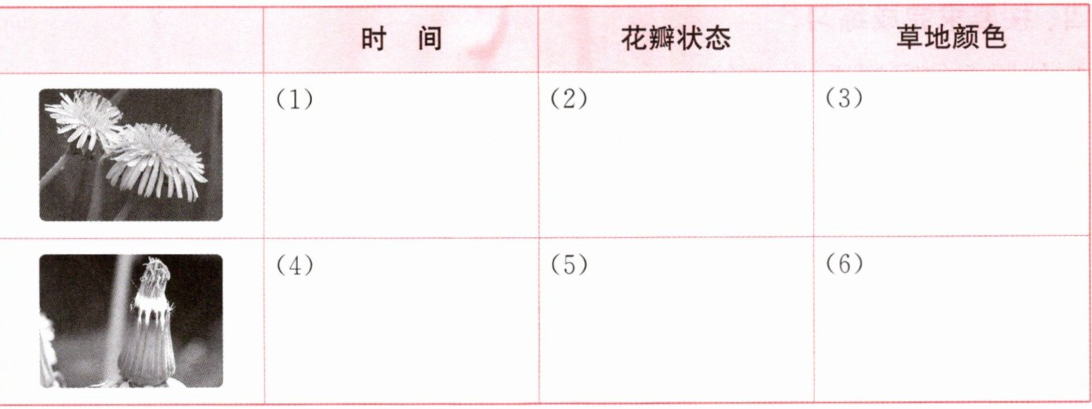 ) 。答案:(1)中午 (2)张开 (3)金色 (4)早晨或傍晚 (5)合拢 (6)绿色 (7)蒲公英的花瓣有时张开有时合拢