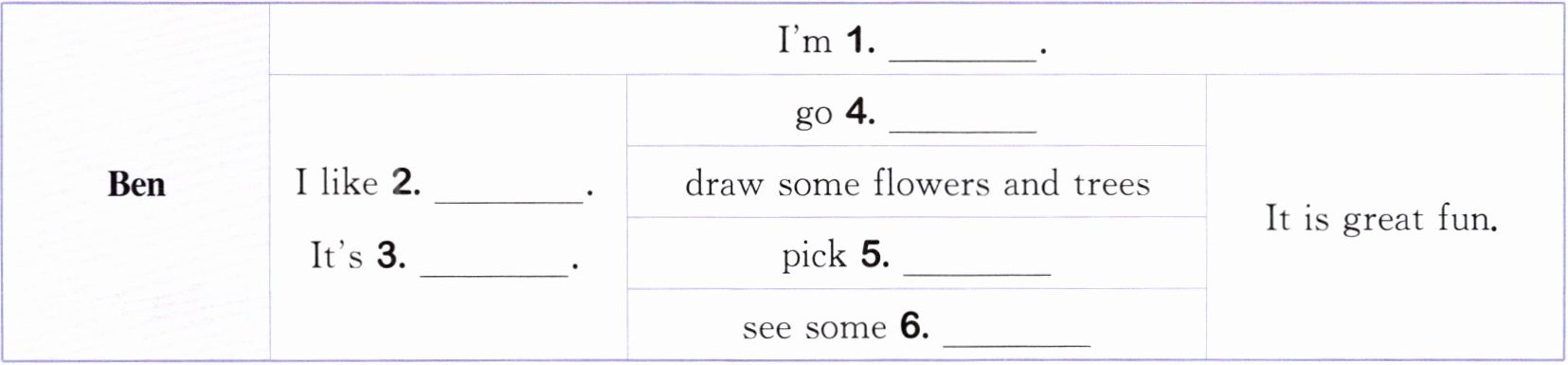 | It is great fun. |答案:1. twelve 2. autumn 3. cool 4. climbing 5. fruit 6. birds