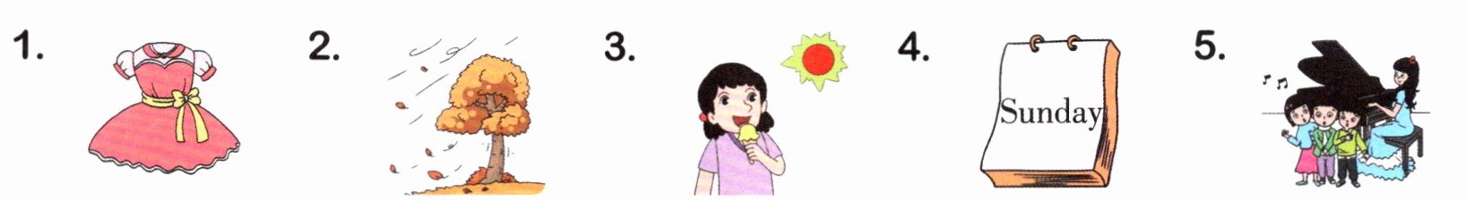 5. 第五幅图是孩子们在唱歌跳舞,B选项提到“We can sing and dance in this lesson. It's great fun.”(我们可以在这个课上唱歌跳舞。它非常有趣。)唱歌跳舞符合描述,所以5对应B。