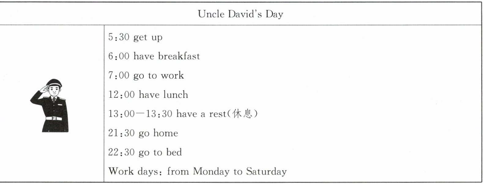 ||5:30 get up6:00 have breakfast7:00 go to work12:00 have lunch13:00—13:30 have a rest(休息)21:30 go home22:30 go to bedWork days: from Monday to Saturday|