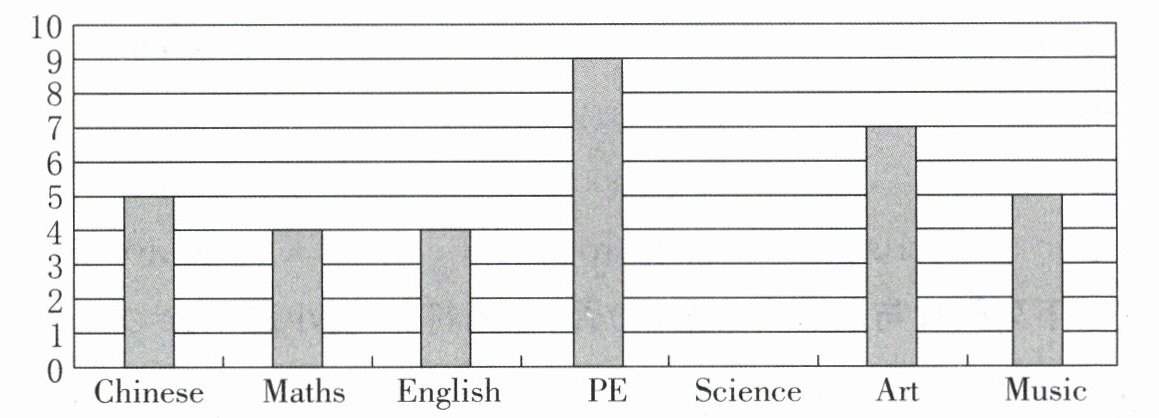十、[跨学科题]文萃小学四(2)班进行了一次“我最喜爱的学科”调查统计,结果如下图(每位学生限选一门最喜爱的学科)。阅读条形统计图,完成任务。(共 10 分)