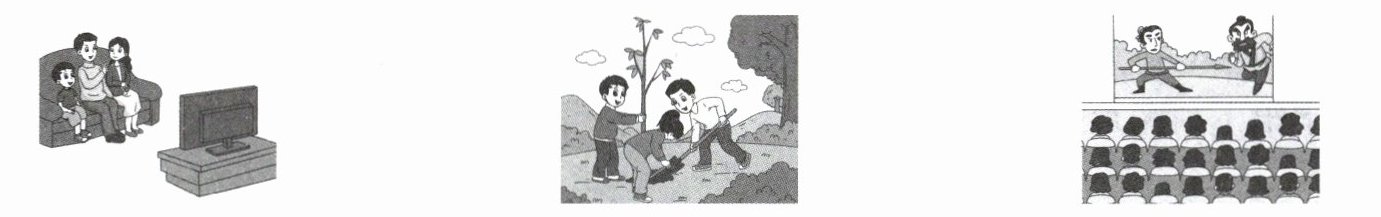 任务一:根据Jack的介绍,活动顺序为“上午种树→去动物园→下午踢足球→晚上看电影→晚上9点看电视”。图片依次对应:看电视(5)、种树(1)、看电影(4)、动物园(2)、踢足球(3)。