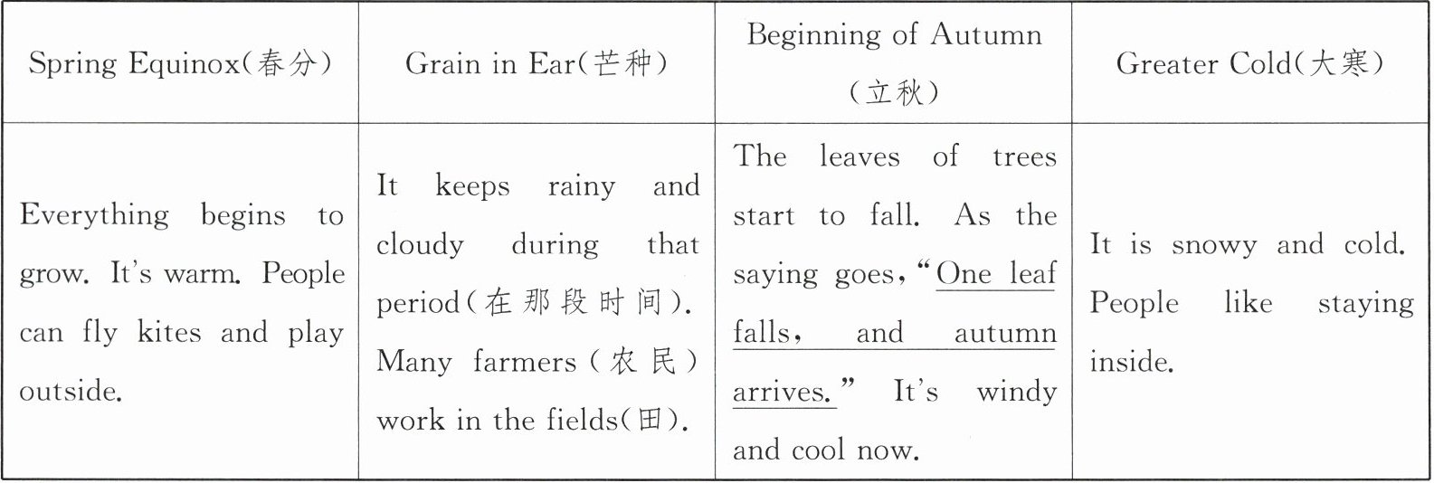 | Everything begins to grow. It’s warm. People can fly kites and play outside. | It keeps rainy and cloudy during that period(在那段时间). Many farmers(农民)work in the fields(田). | The leaves of trees start to fall. As the saying goes,“One leaf falls,and autumn arrives.” It’s windy and cool now. | It is snowy and cold. People like staying inside. |
