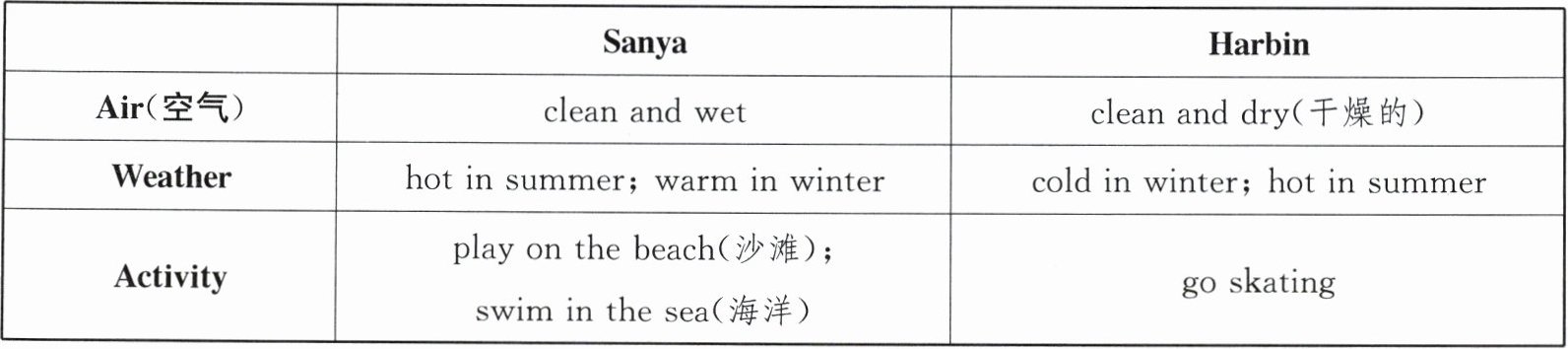 十、[新素材]Mike 想去旅游,他比较了三亚和哈尔滨两个城市。请阅读表格,完成句子。(每空 2 分,共 12 分)