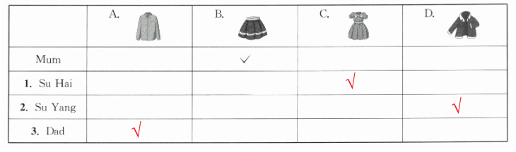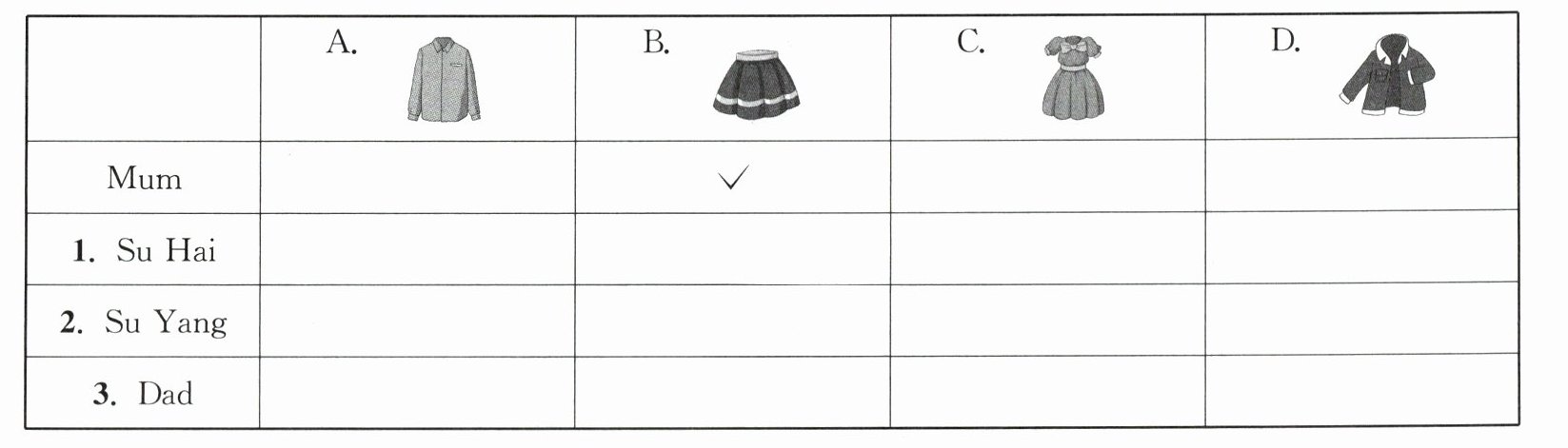 四、[新考法]新年到了,妈妈给家人准备了新的衣服。听录音,根据所听短文,在对应的服饰下画“√”。(每小题 4 分,共 12 分)