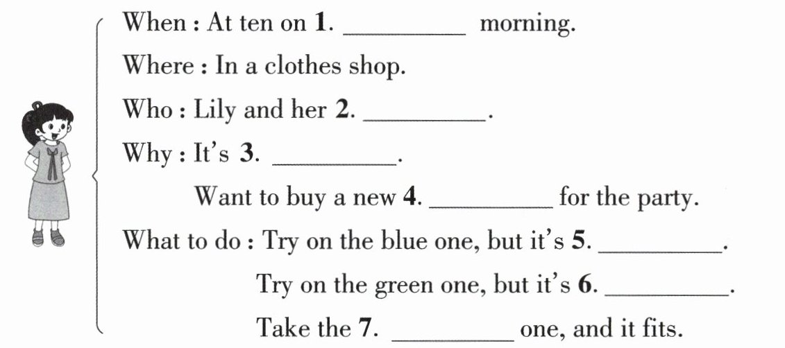 I’m Lily. Now it’s ten o’clock on Sunday morning. I go to a clothes shop with my mum. It’s hot. I want to buy a new dress for the party. There are many dresses in the shop. I try on the blue one,the green one and the white one. The blue one is too small and the green one is so big. So I buy the white one. It fits(合身)me very well. I like it very much.