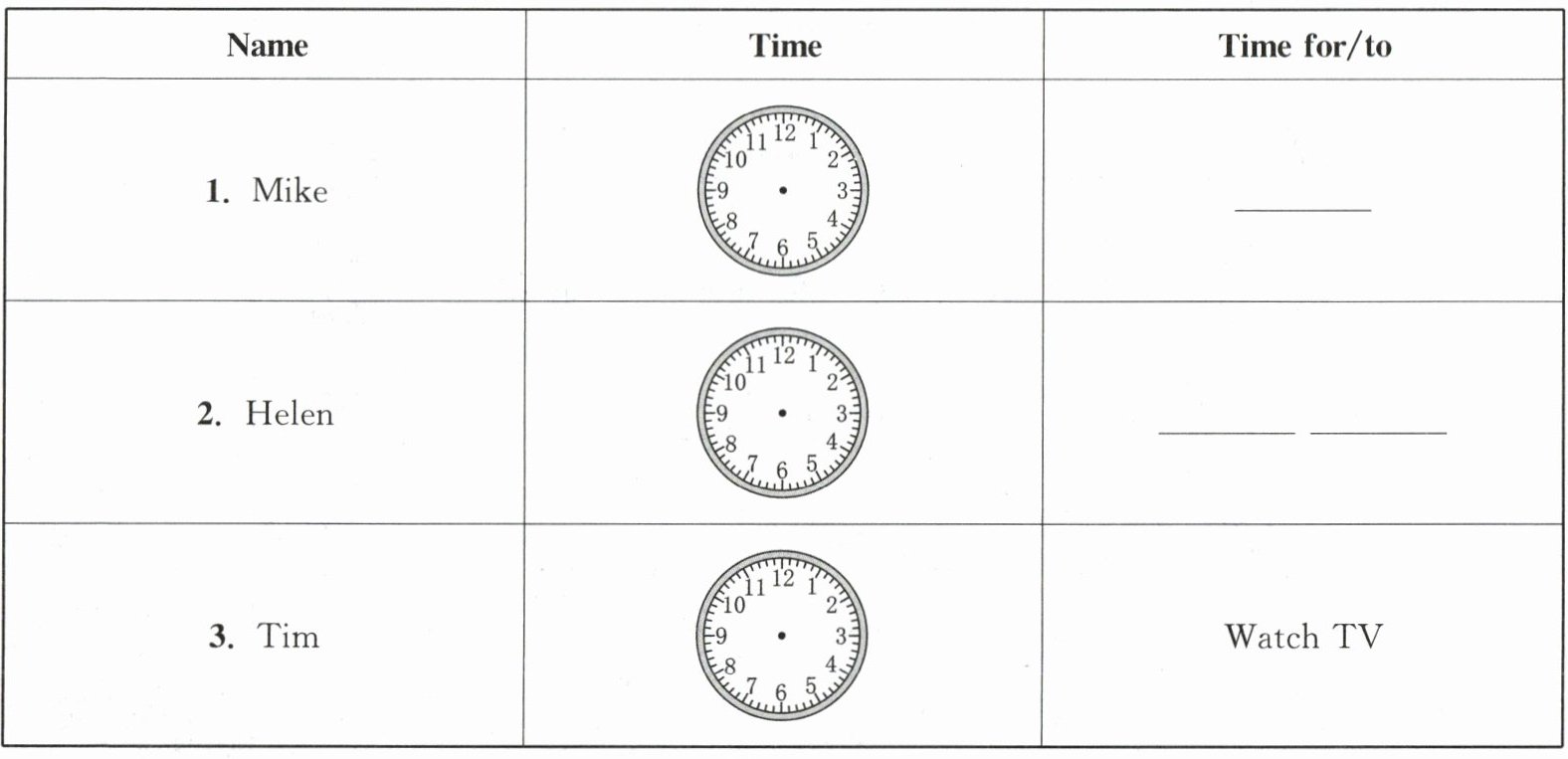 三、[新考法]听录音,根据所听内容,给时钟画上正确的时间,并补全表格。(每小题 2 分,共 6 分)