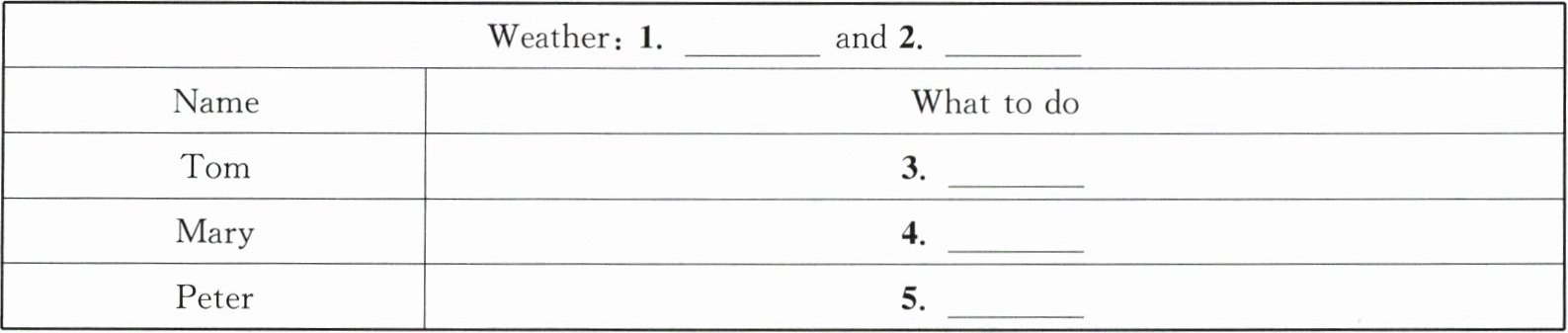 )答案:1. Tuesday 2. sunny 3. football 4. dress 5. eyes