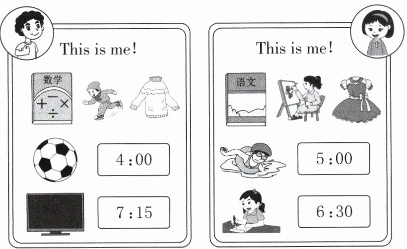 例: Hello. I'm John. I like Maths best because I'm good at it. I like skating. I can skate well. I have a cool sweater. I play football at four. I watch TV at seven fifteen.