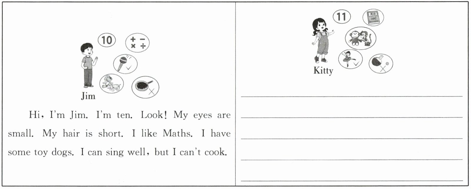 | Hi, I'm Jim. I'm ten. Look! My eyes are small. My hair is short. I like Maths. I have some toy dogs. I can sing well, but I can't cook. |