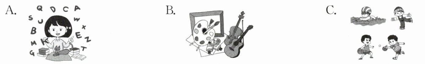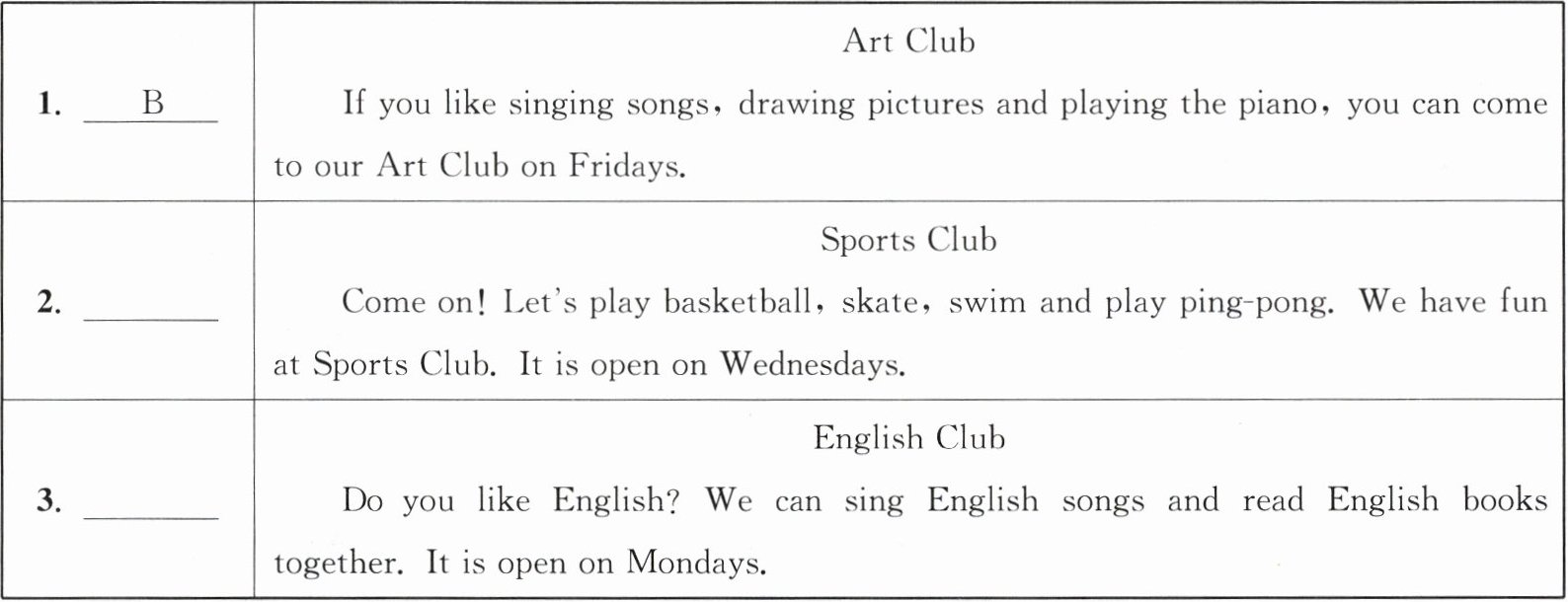| 1. B | If you like singing songs, drawing pictures and playing the piano, you can come to our Art Club on Fridays. |