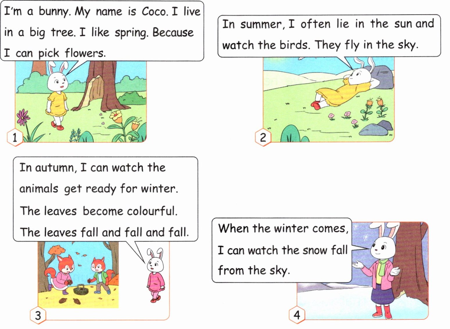 I'm a bunny. My name is Coco. I live in a big tree. I like spring. Because I can pick flowers.