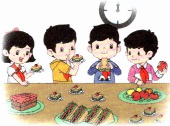 Our tummies rumble. What's for lunch? We have some sandwiches, cakes and fruit to eat!