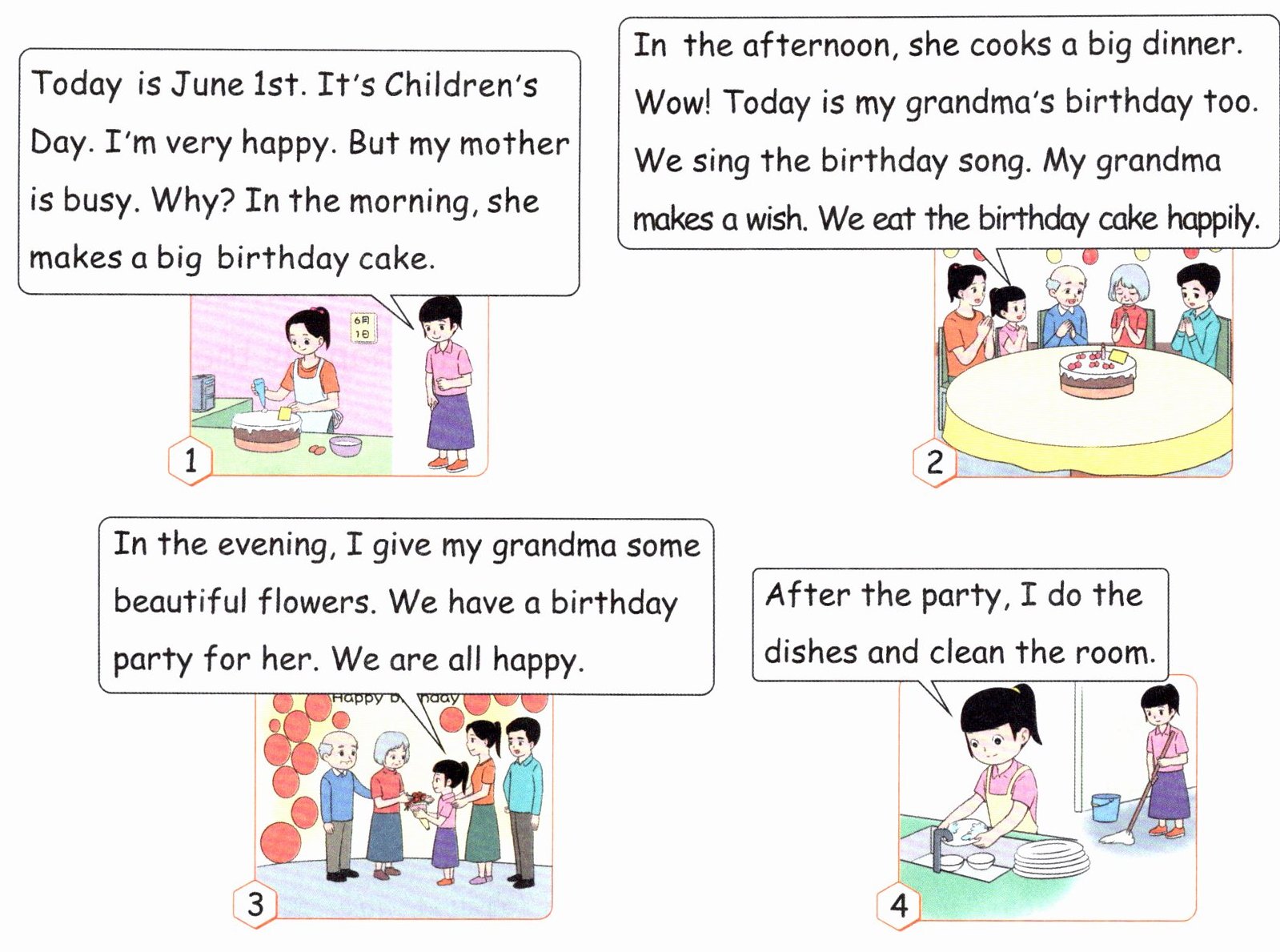 In the afternoon, she cooks a big dinner. Wow! Today is my grandma's birthday too. We sing the birthday song. My grandma makes a wish. We eat the birthday cake happily.
