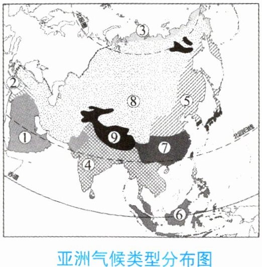 (5)小明的模拟旅行:沿北回归线做一次横穿如上亚洲气候类型分布图中所示大洲的旅行,依次穿过的气候类型为①