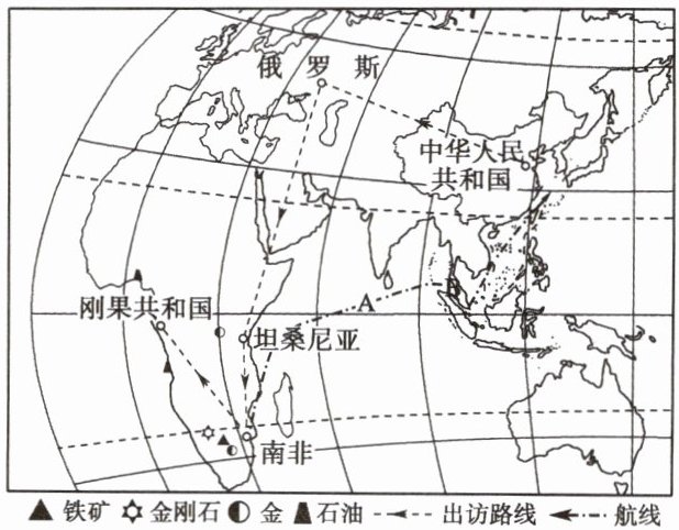 中国援建的坦赞铁路,被誉为“南南合作”的典范;南非具有丰富的矿产资源,是中国重要的工业原材料产地之一。右图为习近平主席出访俄罗斯、坦桑尼亚、南非共和国和刚果共和国并出席在南非共和国德班举行的“金砖国家”领导人第五次会晤的线路示意图。读图,回答下列问题。