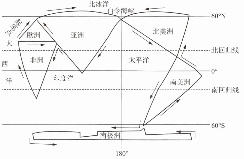 某校同学通过“一笔画世界”活动学习世界的海陆分布。下图是一位同学的作品图。据此,回答6~7题。