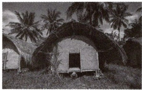 船形屋是某区域的一种传统民居。民居的地面由当地的土黄泥铺垫,墙壁由树木的枝干作支撑,里外抹上黄泥,屋顶由树枝和当地产的草搭成。该房屋既防雨又防潮,还能防暑且通气性好。据此,回答27~28题。