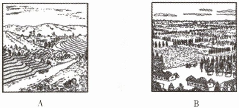 地为最佳观赏地。(填字母)(5) 小明看到的甲地地形景观,可能是下面两幅图中的