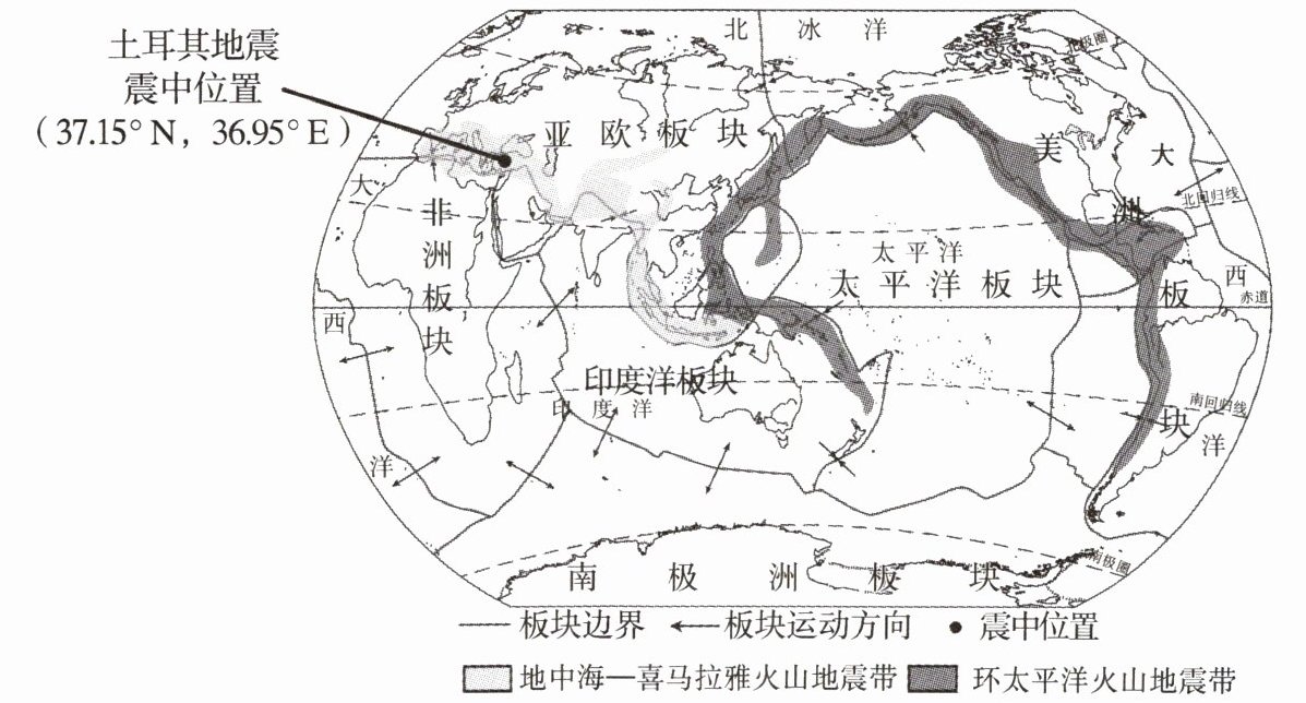 2022年,全球共发生里氏6.0级及以上地震112次;2023年2月6日9时17分,土耳其发生里氏7.8级地震。下图为世界火山地震带和2022年全球里氏6.0级及以上地震分布图。读图,回答16~18题。
