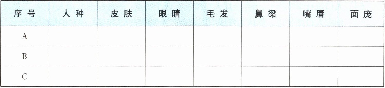 |序号|人种|皮肤|眼睛|毛发|鼻梁|嘴唇|面庞|