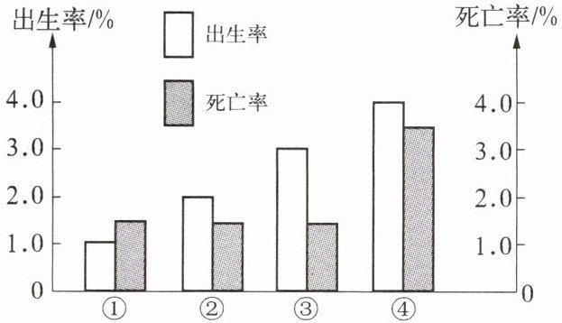15. 右图为四个国家的人口出生率和死亡率图。读图,回答下列问题。