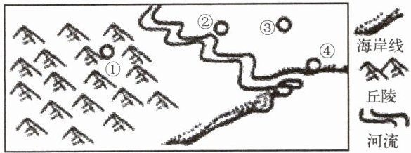 7. 右图是中纬度的某地区,仅从图中所提供的信息考虑,四地中最不可能形成城市聚落的是(