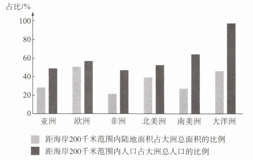 距海岸200千米范围内,陆地面积占大洲总面积的比例和人口占大洲总人口的比例如下图。读图,回答12~13题。