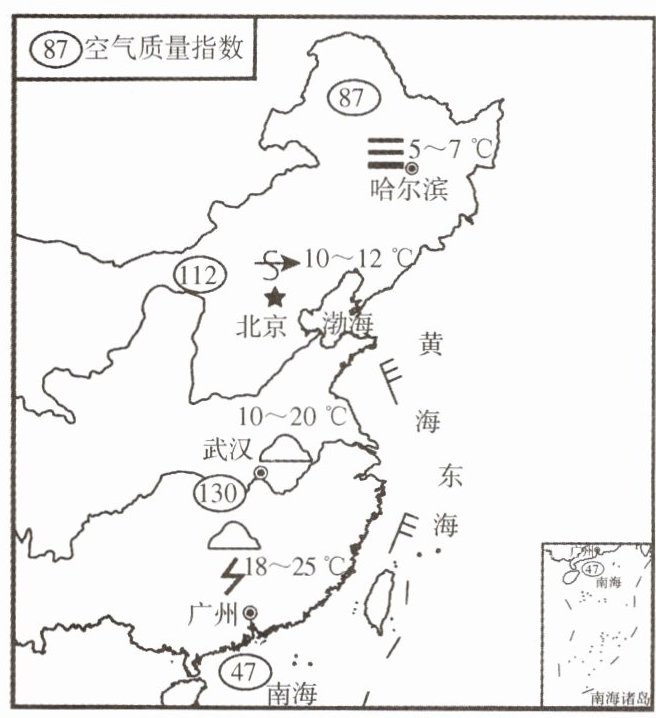 (填“增大”或“减小”)空气质量指数,使当地的空气质量降低。(2) 此日,哈尔滨、北京、武汉、广州四个城市中,气温日较差最大的是