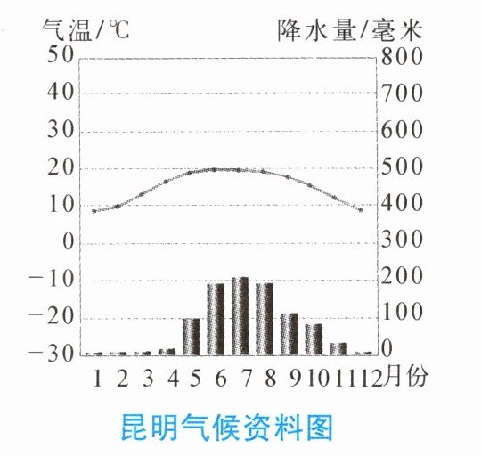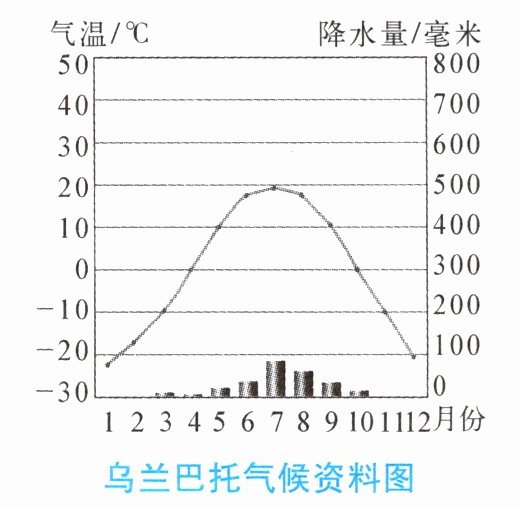 毫米。(3) 从气温和降水量两个方面进行比较,说说乌兰巴托和昆明的气候主要有哪些差别。