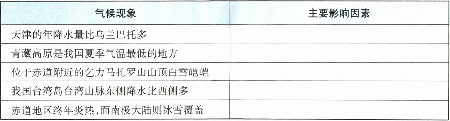 (2) 综合纬度位置、海陆位置、地形等因素对气候的影响,填写下面的表格。