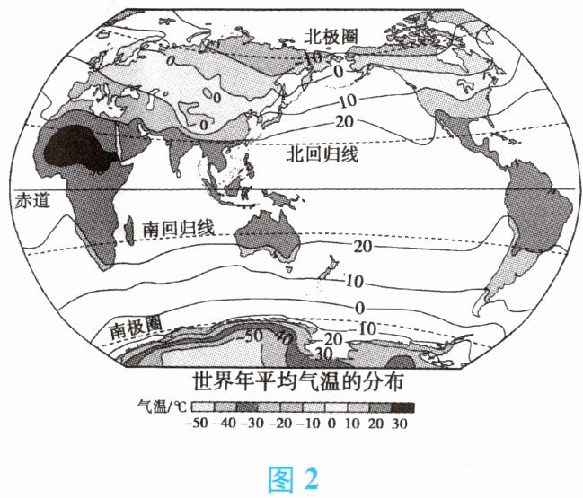 (1) 从图2可以看出,世界年平均气温大致由低纬度向高纬度