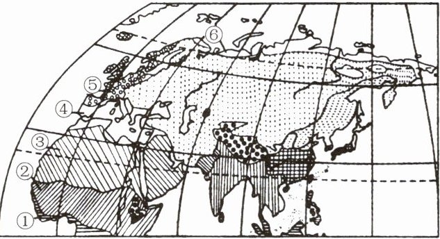 8. 读右侧世界局部地区气候类型分布示意图,写出图中①~⑥所在地的气候类型名称。