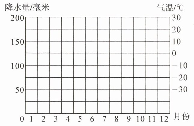 9. 下表是某市多年各月的平均气温和降水资料统计表,请你帮助绘制气温变化曲线和降水柱状图,并根据图中内容,回答下列问题。