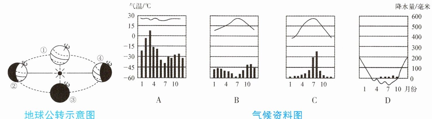 10. 读地球公转示意图及气候资料图,回答下列问题。