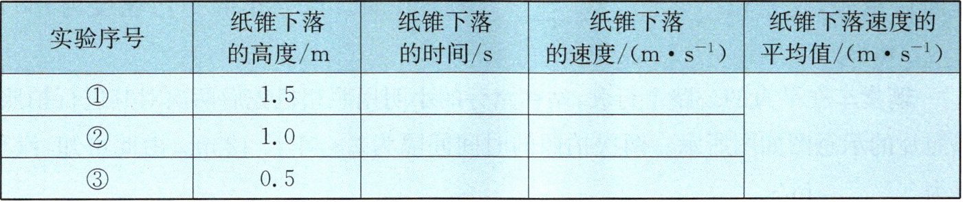 |实验序号|纸锥下落的高度/m|纸锥下落的时间/s|纸锥下落的速度$/(m·s⁻^1)$|纸锥下落速度的平均值$/(m·s⁻^1)$|